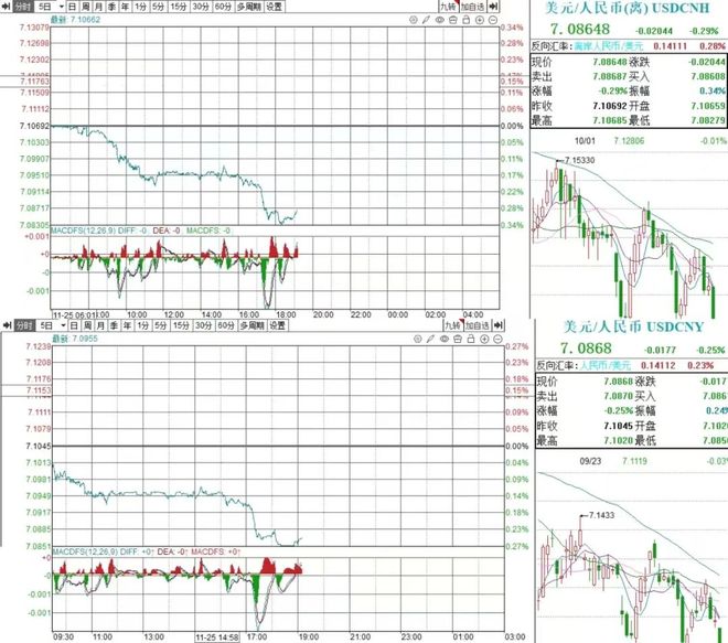 11月25日,人民币汇率创一年多来新高,在岸、离岸人民币对美元汇率双双触及7.09关口。今日早盘,人民币汇率呈现上行势头。随着下午交易的进展,估值趋势进一步巩固。中国外汇交易中心数据显示,11月25日银行间外汇市场人民币汇率中间稳定价为7.0826元兑1美元,较前一交易日上升21个基点,为汇率走势奠定了坚实基础。在岸市场,今日人民币兑美元汇率最高升至7.0851,创去年10月中旬以来新高。 Hig 较年内最低点 7.3518 升值 2,667 个基点。国外市场反应更为积极。离岸人民币兑美元汇率保持稳定荣全天波动,成功突破7.09关口,创下7.08305的历史新高,这也创下了一年多来的新高。较年内低点 7.42879 升值超过 3,457 个基点。事实上,我国今年的出口表现超出预期,加上7月份以来国内资本市场走强,不仅增加了结汇需求,也增强了市场对人民币的信心。值得一提的是,进入四季度,美元指数逆势上行,重回100关口上方。没错,但在这样的背景下,人民币仍然表现强劲。业内分析人士认为,这一方面是由于人民币相对于非美货币在基础和资本流动方面表现强劲,另一方面是因为人民币汇率一致性持续发出升值信号。就非U而言。柯伦等。其中,CFETS人民币汇率指数报98.22; BIS货币篮子人民币汇率指数报104.66; SDR货币篮子人民币汇率指数报92.60。据《上海证券报》报道,产业研究外汇商品部总经理助理、高级研究员张俊涛对记者表示,近期人民币中间价保持强势,在岸人民币汇率与中间价窄幅波动。但随着欧元、日元等其他非美货币兑美元大幅走软,人民币的相对稳定性凸显,人民币汇率指数再创新高。央价发出的信号也值得关注。 “近期,人民币汇率稳定向更强方向调整。”东方金城首席宏观分析师王庆认为,这可能是相对的。美元贬值期间人民币兑美元略有升值。上半年美元指数。当前稳定汇率的重点正在转向稳定人民币对CFET等一篮子货币的汇率指数。展望后市,业内人士认为,美元指数接下来的上行缺口有限,而人民币走势将稳中偏强。四季度结汇的季节性需求将为人民币走势提供重要支撑。东方金城首席宏观分析师王庆表示,虽然未来美联储可能继续降息,但美元指数上涨空间有限。不过,美元自年初以来大幅下跌,市场对美联储降息反应,利空因素被挖出来,美元指数也将呈现出一些下行趋势。未来一段时期的稳定性。拍拍网财富研究总监刘友华表示,人民币中间一致率未来有测试“7”大关的潜力。一方面,美元疲软,国内基本面向好;另一方面,季节性结汇需求也会提供助力。但汇率走势受多种因素影响,央行维稳意愿明确。能否有效“破7”仍存在不确定性,人民币能否维持双向波动。银河证券首席经济学家张军对后市较为乐观。他认为,在基准情景(经济逆周期政策)下,美元兑人民币汇率年底将逼近7.0;乐观情景下,根据模型计算,美元汇率新的均衡位置将在6.7左右。埃迪托|||徐少航校对杜恒峰|金明宇 封面图片来源:视觉中国(AI生成)每日经济新闻综合自秘境网、上海证券报、澎湃新闻、21世纪经济报道