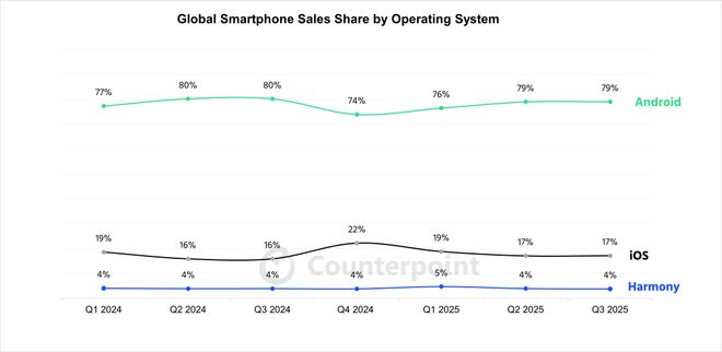 智通财经APP获悉,11月28日,Counterpoint Research发布了2024年Q1至2025年Q3全球智能手机按操作系统销量份额,内容涵盖美国、中国、印度三大主要市场Android、iOS和Harmonyos的份额分布。 Android以79%的份额继续保持全球领先地位,但由于竞争加剧,较2024年Q3下降了1个百分点。iOS在2025年Q3将占全球销量的17%,较去年同期增加1个百分点。在中国市场,鸿蒙在 2025 年第三季度获得了 14% 的份额,超越其他平台,成为中国第二大智能手机操作系统。资料来源:Counterpoint Research 2025 年第三季度全球智能手机销量同比增长 4%,是 2021 年以来最强劲的 9 月份,大部分地区继续复苏。 Android 继续保持其全球领先地位份额为 79%,但由于竞争加剧,较 2024 年第三季度下降了 1 个百分点。三星 Galaxy 可折叠屏幕系列帮助抵消了市场份额。荣耀在多个地区的增长也为Android系统的性能提供了支撑。 2025 年第三季度,iOS 将占全球销量的 17%,较去年同期增长 1 个百分点。 iPhone 17系列在全球范围内的初步反应好于预期,在美国、日本、印度等关键市场增长显着。此外,老款iPhone 16系列在印度的节日销售期间也有表现。在中国市场,鸿蒙在 2025 年第三季度获得了 14% 的份额,超越其他平台,成为中国第二大智能手机操作系统。华为nova 14系列是主要增长动力,可折叠屏产品也继续表现出色。然而,搭载Harmonyos的新车型仍然面临一些挑战,因为最初的生态限制。美国、中国和印度 iOS 和 Android 季度市场份额比较。美国市场来源:Counterpoint Research。中国市场资料来源:Counterpoint Research。印度市场来源:Counterpoint Research。