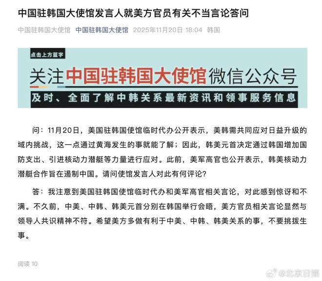 中国驻韩国大使馆发言人就美国官员不当言论作出回应。问:11月20日,美国驻韩国使馆负责人表示,美韩必须共同应对地区内挑战的增加,这一点从黄海事件可以理解;中方对此有何评论?因此,韩国总统和美国总统决定通过增加韩国国防开支和引进核动力潜艇来应对。此前,美国军方高官也曾表示,韩美核动力潜艇合作旨在遏制中国。使馆对此有何评论?答:我注意到美国驻韩国使馆和美军高官对此指控的相关言论,我对此感到惊讶和不满。不久前,中美、中韩、韩元首美国在韩国举行了单独的会议。美国官员的有关言论显然不符合领导人共识精神。我们期待美方多做一些有利于中美、中韩、韩美的事情。关系,不惹事。 (中国驻韩国大使馆)