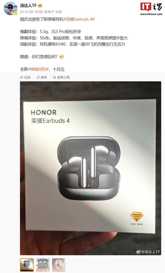 HOME 9月29日新闻,Honor GT系列产品经理@Tang Daren TF昨天在微博中分享了一种新的荣誉产品 - Honor Earbuds 4无线耳机。据他介绍,耳机的重量约为5.3克,支持50 dB的噪音,并具有9个小时的完整电池寿命,并将在10月发布。他在房屋中注意到,用户问荣誉GT系列产品经理@tang daren tf:“荣誉耳机上有耳机吗?”另一方回答“已经在那里”,并说“它很快就自行开发了。”作为参考,LCHSE耳朵夹耳机的尊严亲自推出了第二代,并将于今年8月推出。与上一代人相比,耳机主要增加耳机的电池容量,这与单个耳机的一致性增加了1小时,而在其他方面则不会改变其他方面,价格为399元。