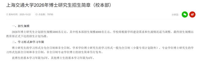 近日,上海交通大学发布2026年博士生招生简章,其中指出,2026年博士生计划招生规模近5000人。事件引发网友热议。有网友认为报名人数有点高,也有网友好奇。据此前媒体报道,三年来,上海交通大学博士招生规模扩大了40%以上。上海交通大学发布2026年博士生招生简章。上海交通大学研究生招生网站官方招生简章显示,2026年博士生规划招生规模约为5000人,其中学校主力招生规模约为4000人。学校将根据缺口学科建设需要和学生资源情况进行适当调整。最终规模以教育部正式下发的招生计划为准阳离子。学习方式分为全日制和兼读制。直接博士生的主要学习年限为5年,其他博士生的主要学习年限为4年。此外,招生简章还对选拔程序、申请条件、申请流程、考核等共14项进行了说明。图为网友评论截图。有网友对此表示支持;有网友质疑扩招是否会对学费、住房等产生影响;有网友好奇结束条件是否会随着m数的增加而改变——不是人类;有网友质疑这是否会给本科生、硕士生带来压力;还有网友调侃:这需要多少个转折点?针对此事,一些自媒体博主也表达了自己的态度。 11月5日至6日,记者多次致电招生办询问电话号码。学校宣传部一名工作人员表示会询问此事,但截至发稿,尚未得到回应。据媒体报道,上海交通大学今年将招收5000余名本科新生。据电商杂志等媒体报道,上海交通大学2024年将招收博士生3500人,2025年招收博士生4000人。2026年的账单将比去年增长25%,三年内博士生扩招超过40%。据新华网报道,2025年上海交通大学5000余名本科新生将获得“头等舱”。潇湘晨报记者史继超、吴华康